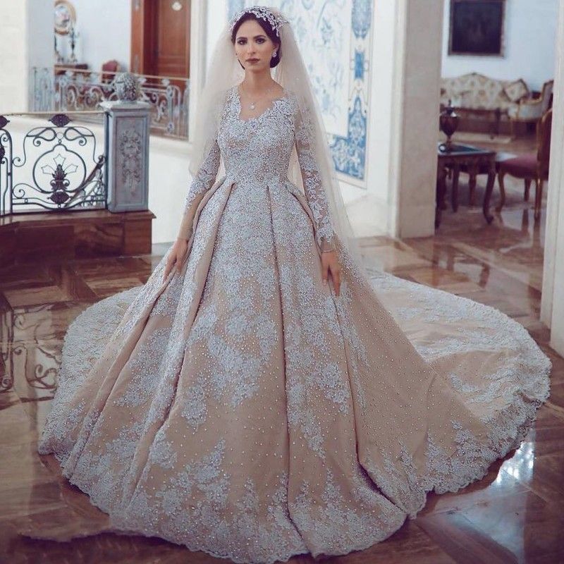 Fantastic Dubai Princess Wedding Dres Sparkly Sequins Beads Full Princess Wedding Dress With Sleeves