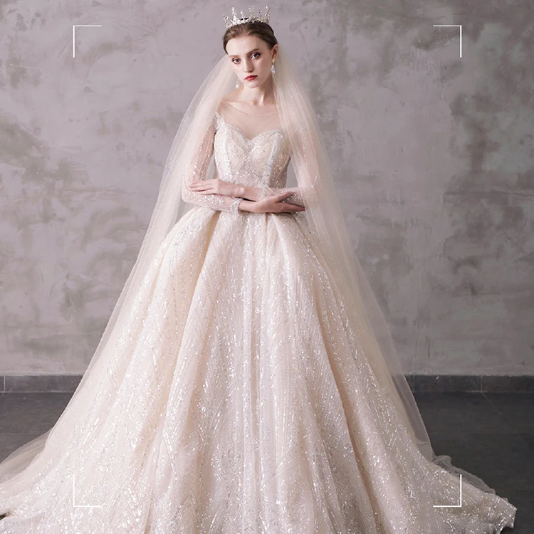 Long Sleeves Crystal Glamorous Lace Princess Wedding Dresses Princess Wedding Dresses With Lace Sleeves