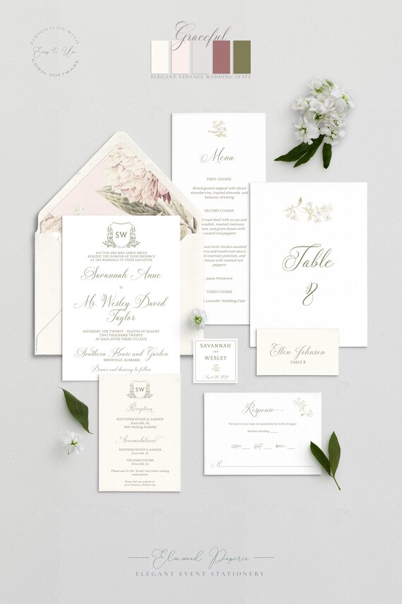 Elegant Monogram Crest Wedding Invitation Template Romantic Printable Wedding Invitation Template