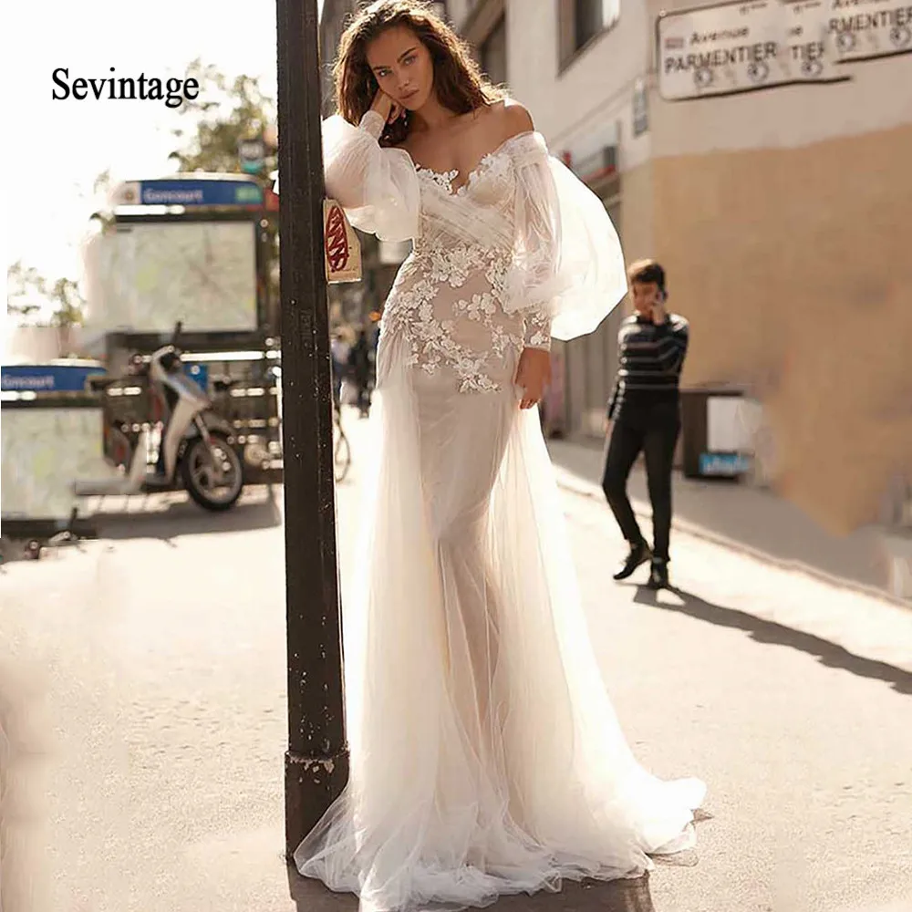 Lorie Beach Wedding Dress Lace Appliques New Design Vestidos De Novia Puffy Sleeved Wedding Dresses