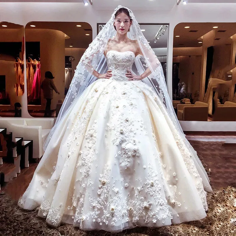 Luxury 3d Applqieus Free Veil Petticoat Ball Gown Strapless Puffy Puffy Wedding Dresses With Long Trains And Veils