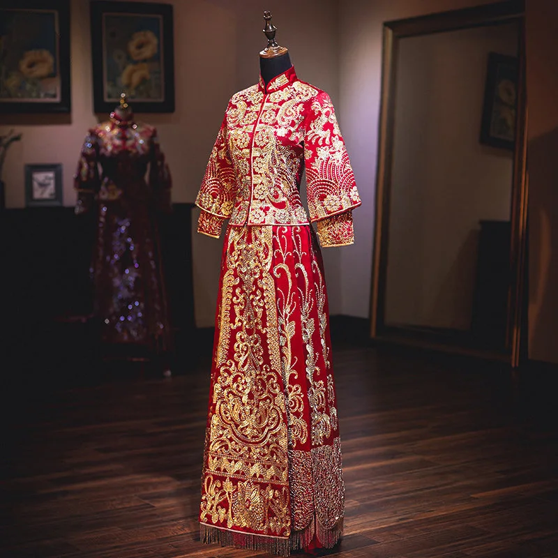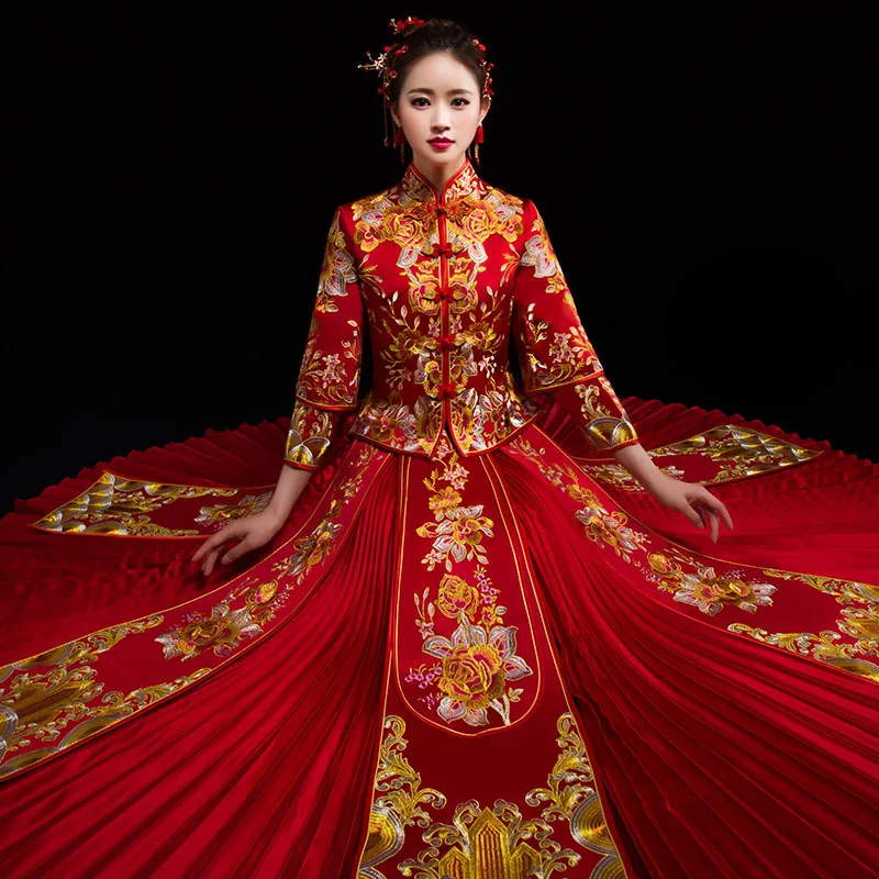 Chinese Queen Inspired Gold Phoenix Embroidered Wedding Xiuhe Qipao Chinese Traditional Wedding Dress