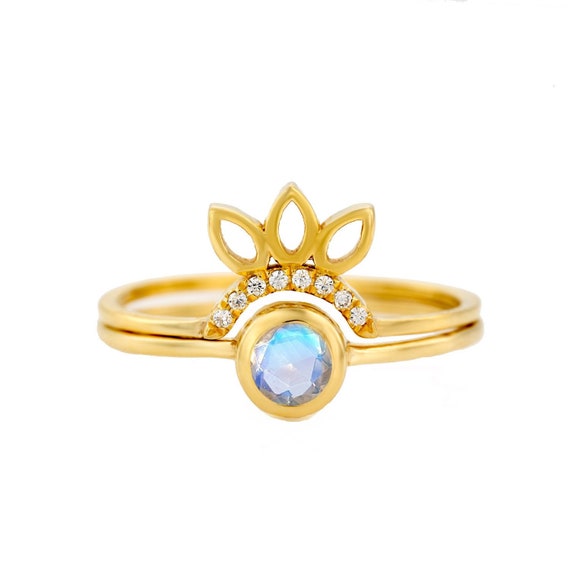 14k Yellow Moon Stone Rainbow Diamond Rings Setstacking Moon Etsy Rainbow Wedding Rings