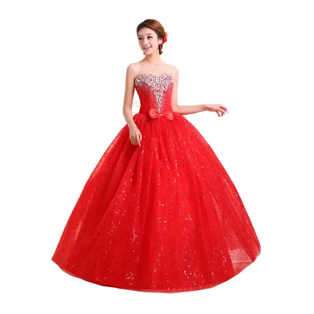 Floral Lace Strapless A Line Ball Gown Chinese Red Trailing Red Strapless Wedding Dresses