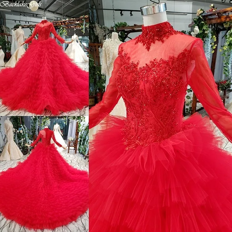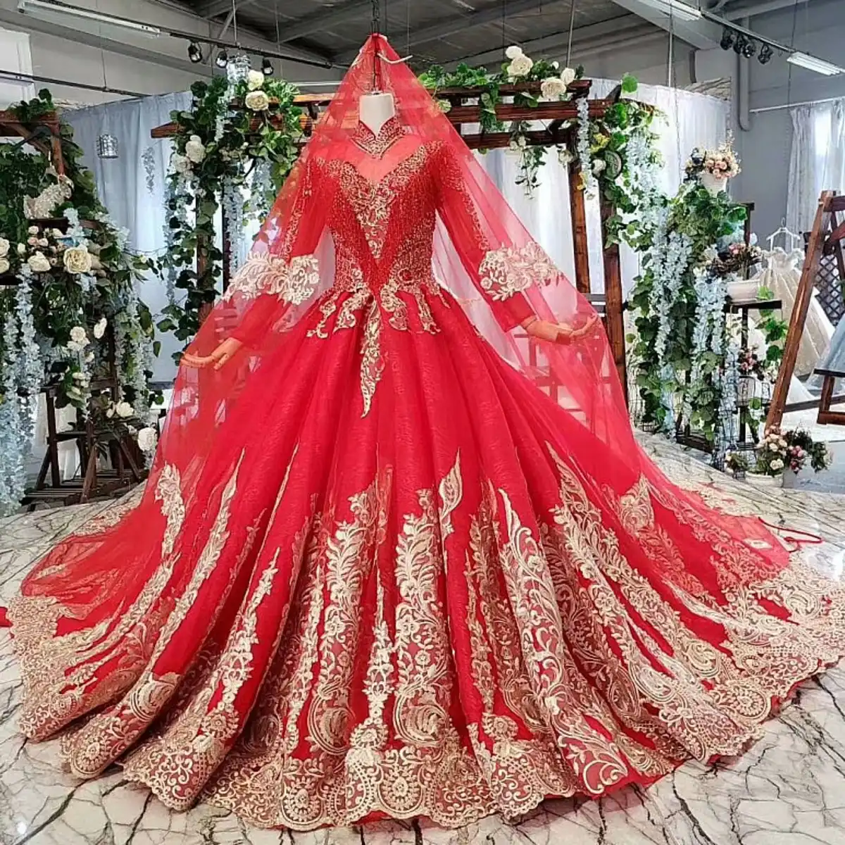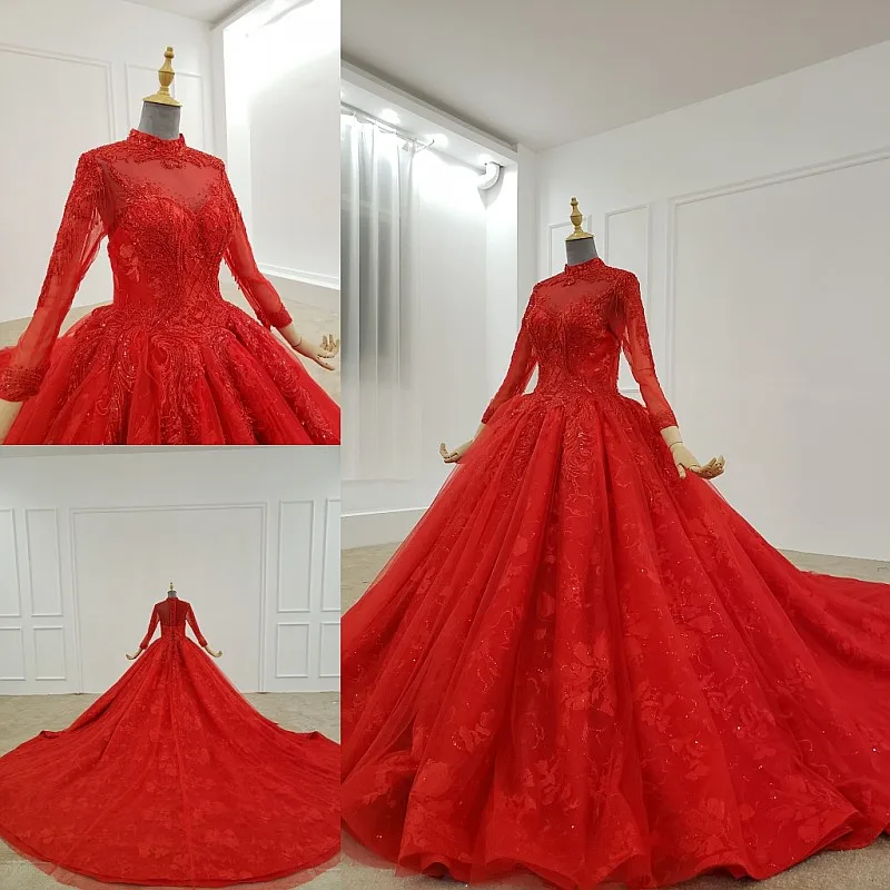 Red Vintage High Neck Muslim Wedding Dresses 2020 Beaded Elegant Red Vintage Wedding Dresses