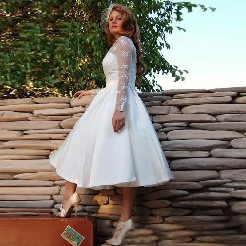Retro 50s 60s Short Tea Length Modest Short Sleeves Wedding Dress Retro Vintage Tea Length Wedding Dress