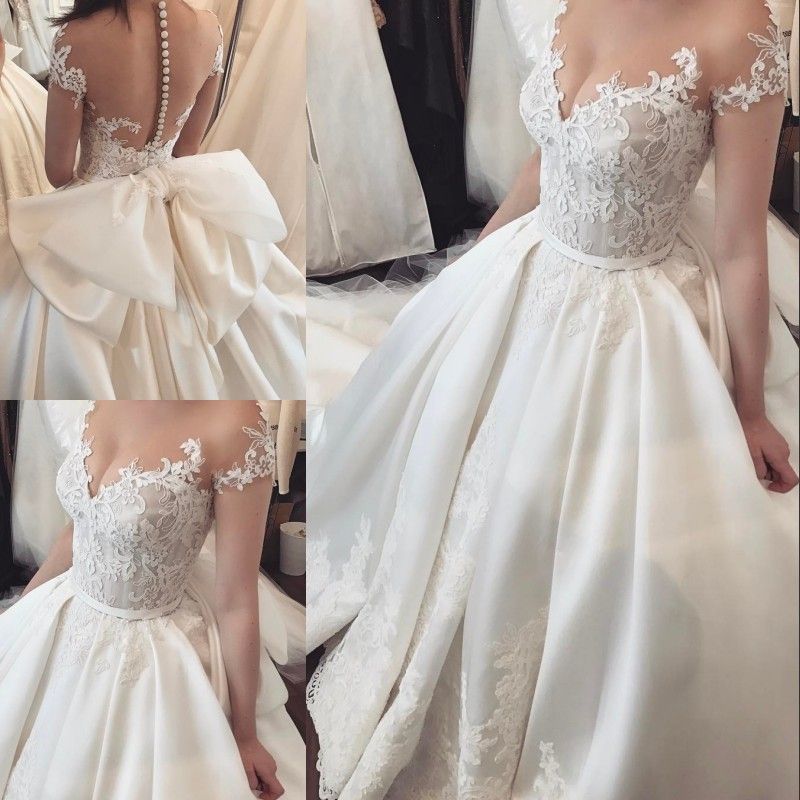 Discount Classic Romance Satin Bridal Dress Sheer Jewel Short Sleeves Lace Applique Big Bow Wedding Dresses Sexy See Through Backless Wedding Gown Bridal Shops Bride Dresses From Xzy1984316 157 5 Dhgate Com Romantic Lace Classic Wedding Dresses