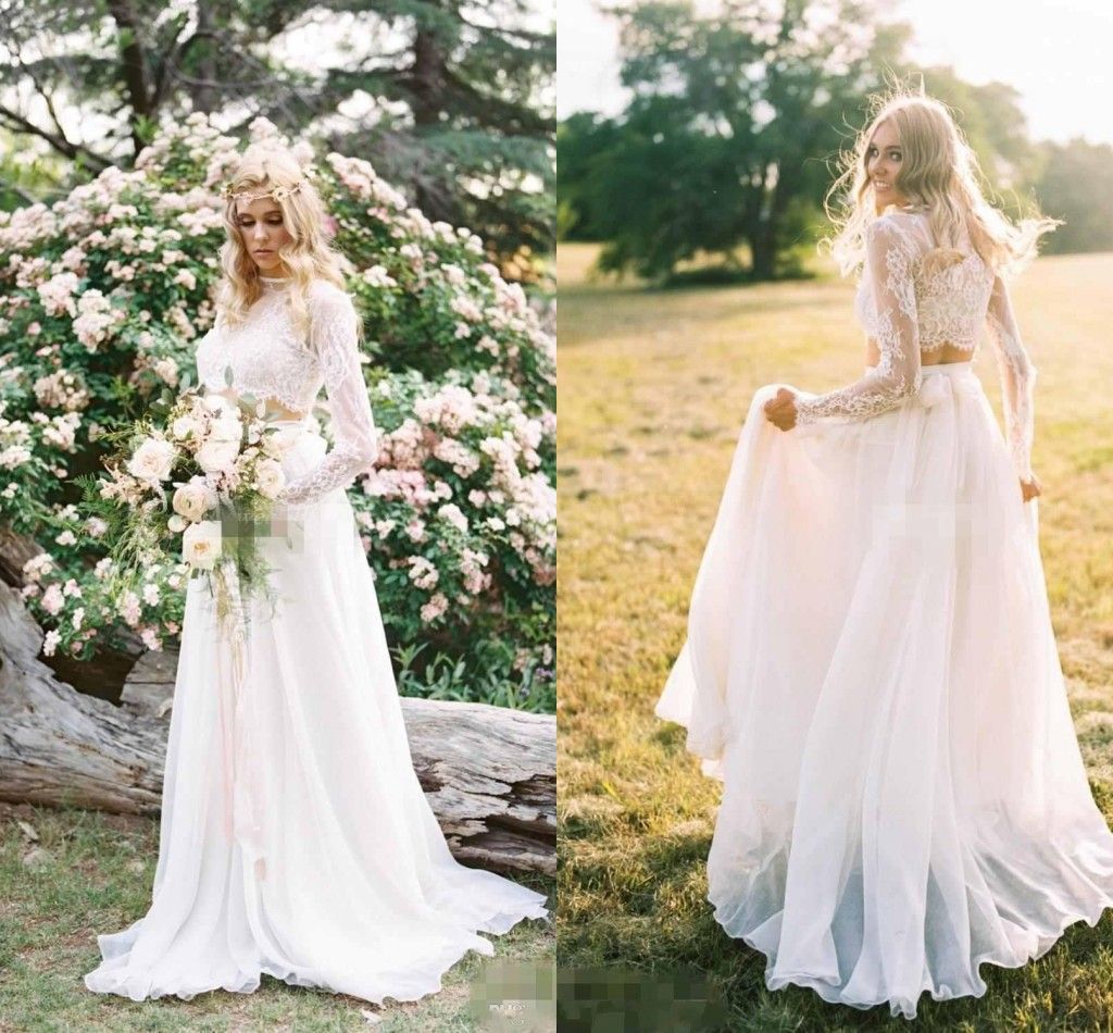 Discount Romantic Two Pieces Boho Beach Wedding Dresses Lace Long Sleeves High Neck Chiffon Bridal Gown A Line Vestido De Novia Custom Made High Fashion Wedding Romantic Wedding Dresses With Sleeves