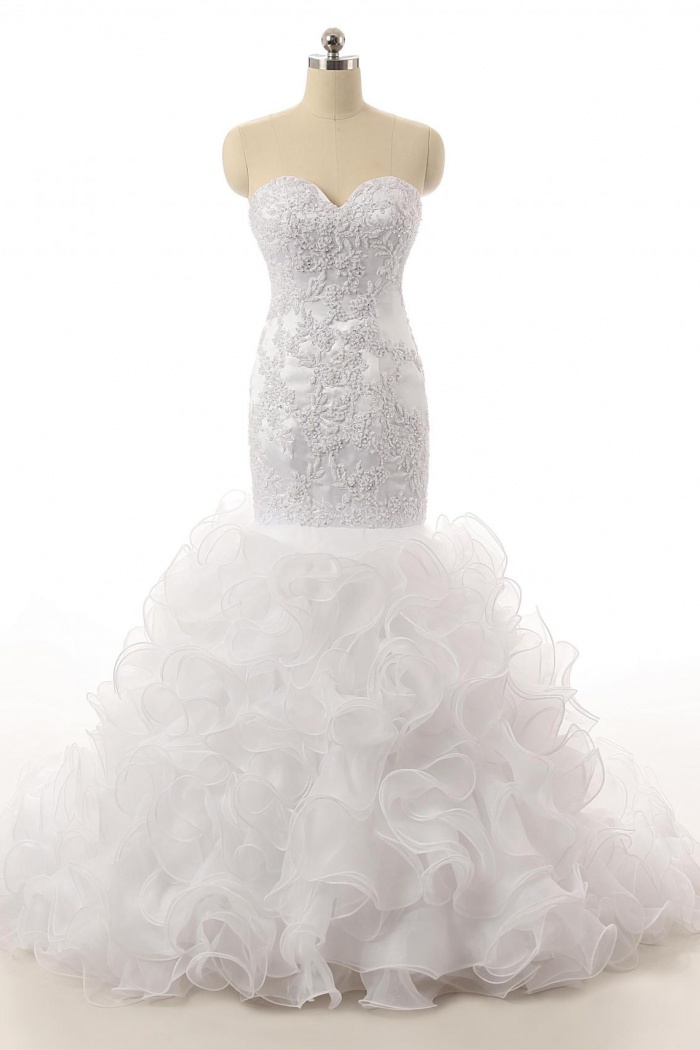 Popular Lace Ruffles Organza Mermaid Scoop Back Strapless Wedding Ruffled Organza Mermaid Wedding Dress