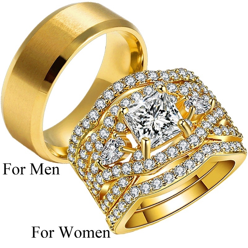 Her His 14k G P Stainless Steel 4pcs Princess Cut Wedding Engagement Ring Men S Band Set Shopee Malaysia S Shaped Wedding Rings