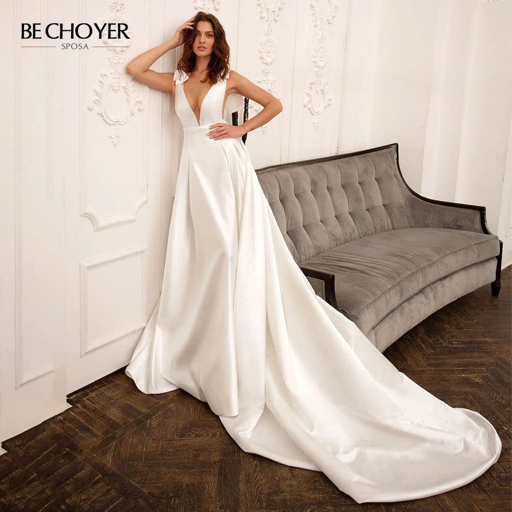 Bow Tie Back Ivory Satin Plunging V Neck Wedding Dress Vq Satin Bow Wedding Dress