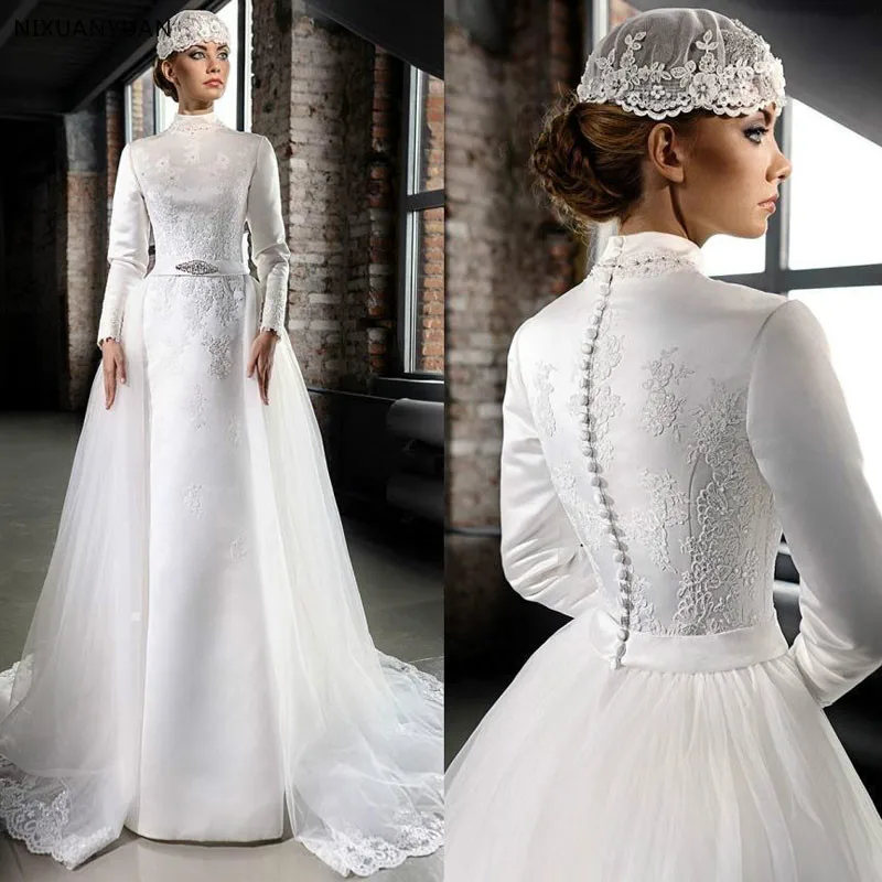 Modern High Neck Satin Wedding Dress Elegant Lace Appliques Button Satin Long Sleeve High Neck Wedding Dress