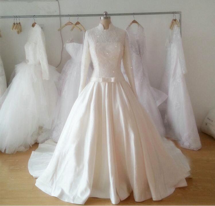 Ball Gown High Neck Full Long Sleeve Court Train Satin Wedding Satin Long Sleeve High Neck Wedding Dress