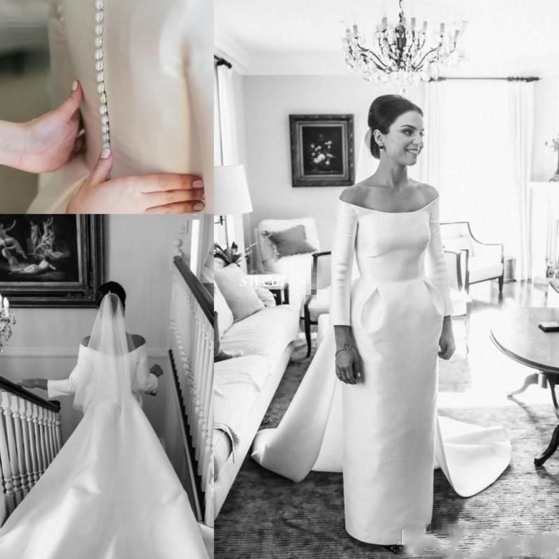 Vintage Long Sleeves Wedding Dresses Bridal Gowns Off Shoulder Satin Off Shoulder Sheath Wedding Dress
