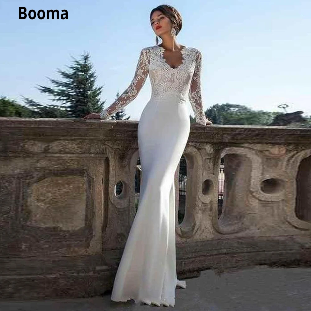 Booma Vintage V Neck Mermaid Wedding Dresses With Long Sleeves Satin V Neck Mermaid Wedding Dress