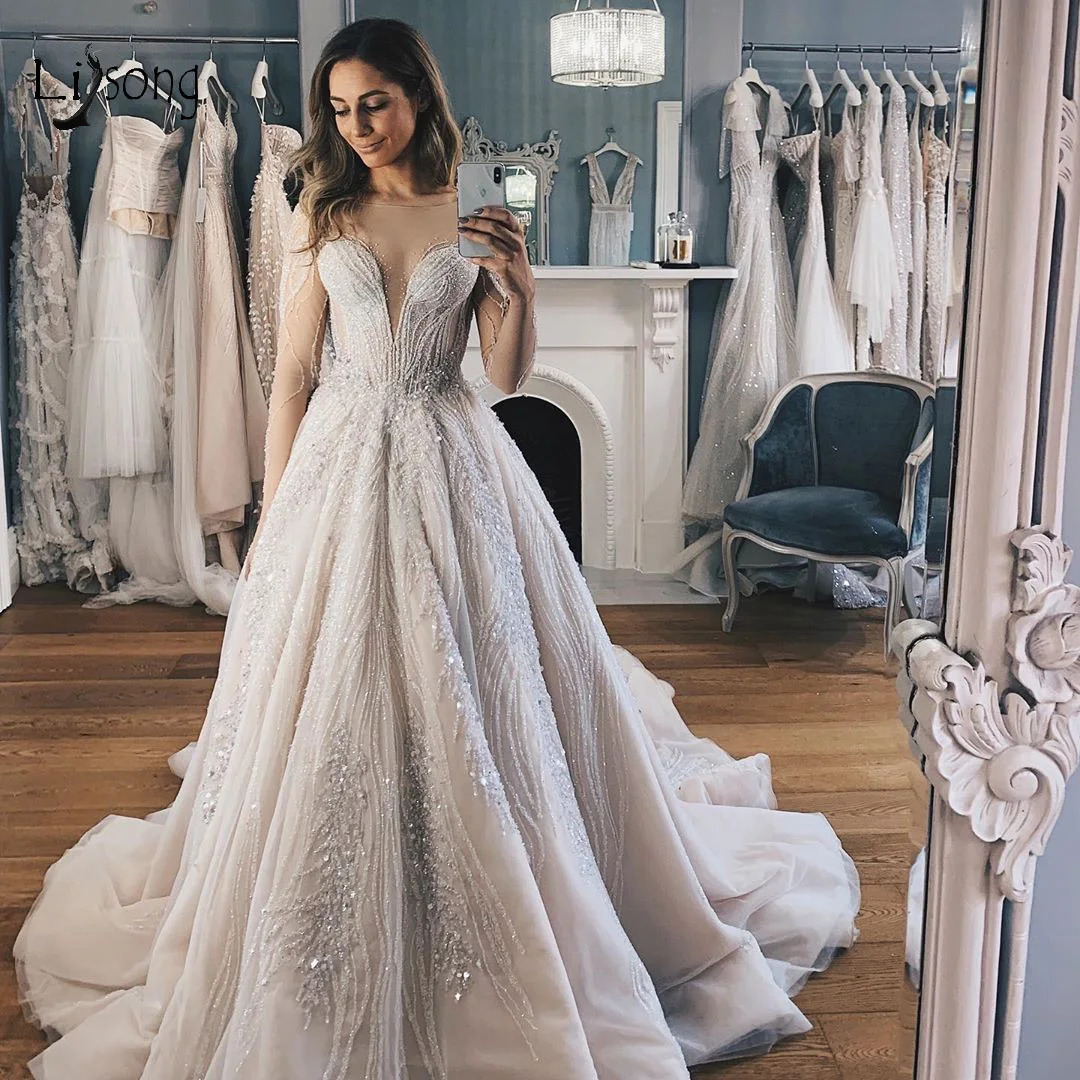 Pretty Sparkle Beaded A Line Wedding Dresses See Thru Full Sleeves See Thru Wedding Dress