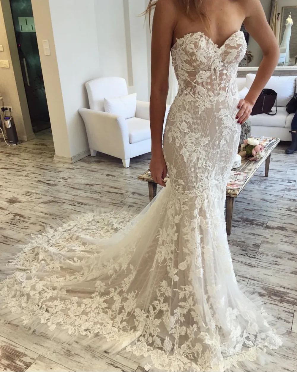 Hot Deal 2019 New Sweetheart Mermaid Wedding Dress Lace Floral Sexy Fitted Wedding Dress