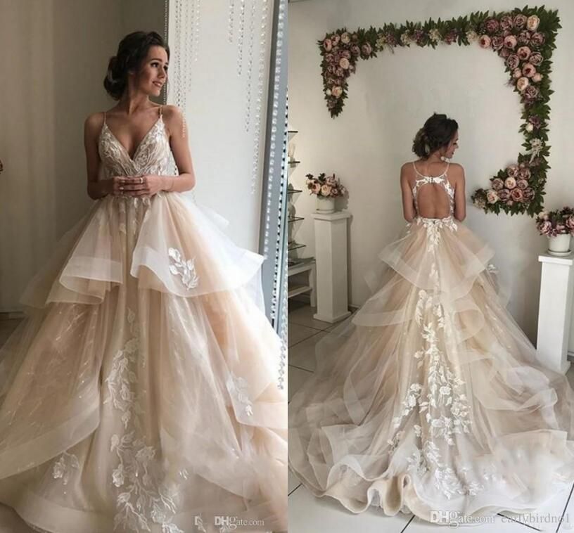 Discount Romantic Champagne Elegant Lace Wedding Dresses 2019 Sexy Romantic Wedding Dresses