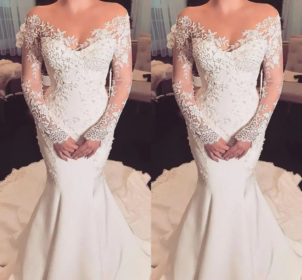 2020 Sheer Lace Long Sleeves Wedding Dress A Line Off Shoulder Sheer Lace Long Sleeve Wedding Dress