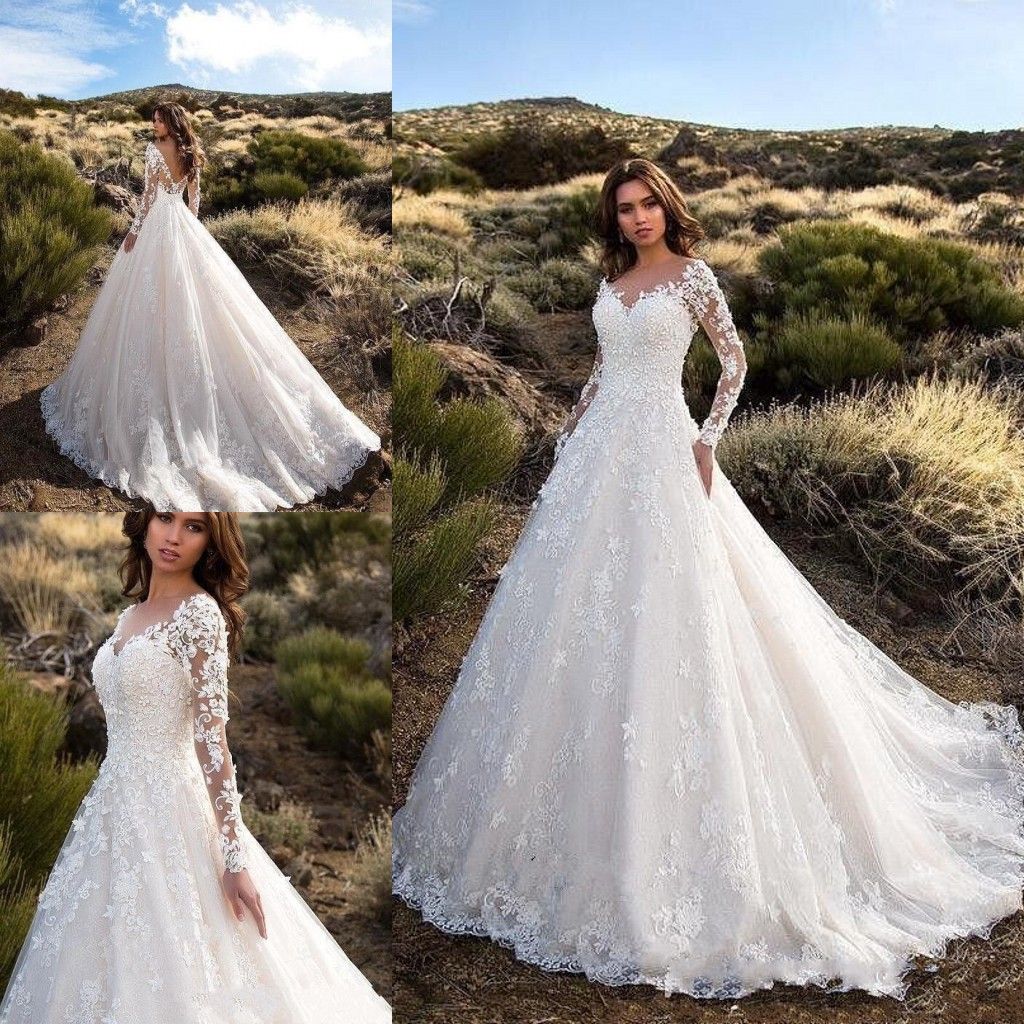 Lace Satin Sheer Back Wedding Dresses A Line Long Sleeve Bridal Sheer Lace Sleeves Wedding Dress