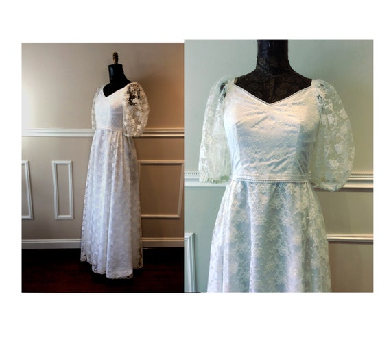 Vintage 1970s Lace Wedding Dress Sheer Puff Lace Sleeves Etsy Sheer Puff Sleeve Wedding Dress