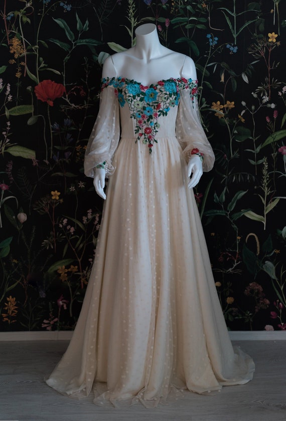 Floral Hand Embroidered Organza Over Sherbet Tulle Bridal Gown Sherbet Wedding Dress