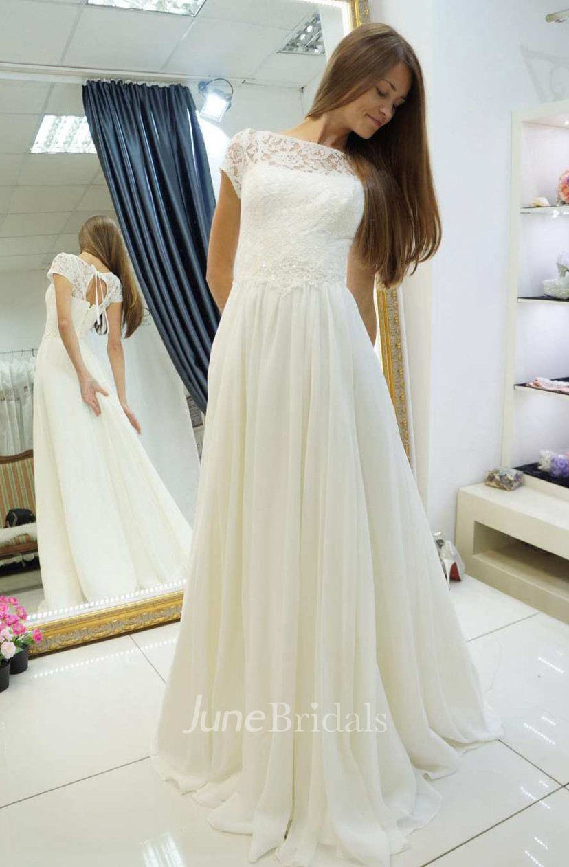 Bateau Short Sleeve A Line Chiffon Wedding Dress With Lace Top And Short Corset Wedding Dresses