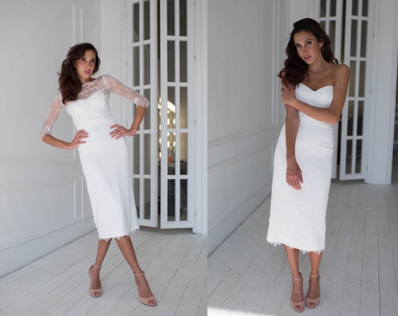 Hot Selling Short Sheath Lace Wedding Dresses With Detachable Short Fitted Lace Wedding Dress