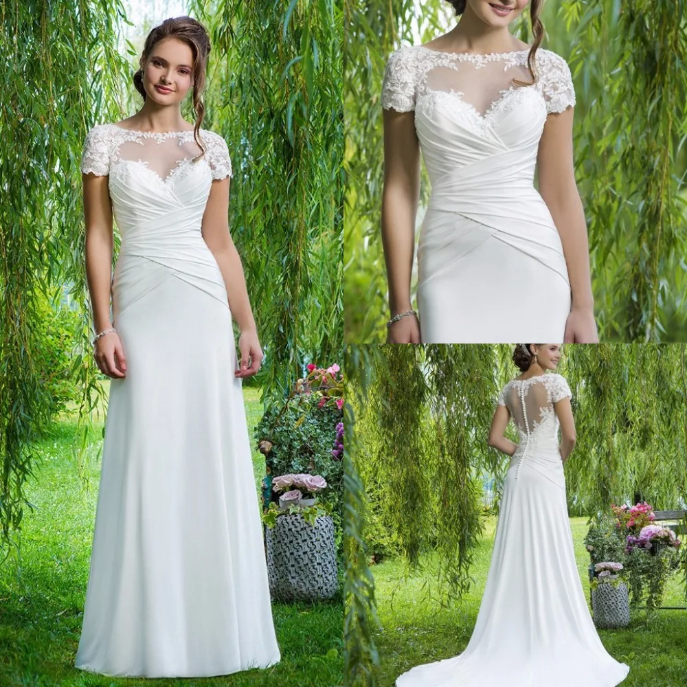 A Line Chiffon Lace Beach Modest Wedding Dress 2020 Short Sleeves Short Garden Wedding Dresses