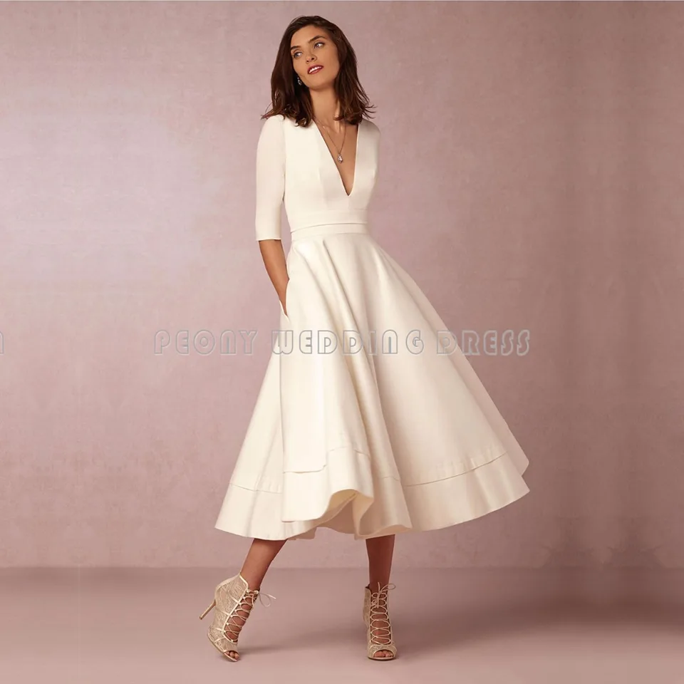Fashion Short Ivory Wedding Dresses 2016 Deep V Neck Tea Length Short Ivory Dresses For Wedding