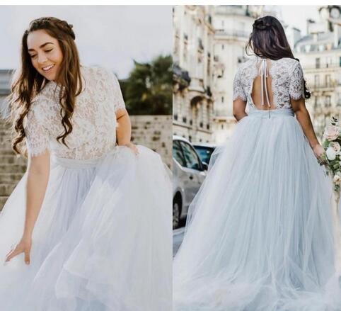 Lorie Wedding Dress Short Sleeves Scoop Lace Top A Line Tulle Short Lace Boho Wedding Dress