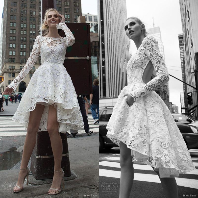 Sexy Deep V Neck Short Wedding Dress Illusion Long Sleeve Lace Short Lace Long Sleeve Wedding Dress