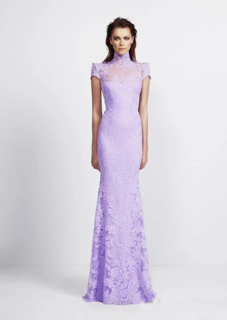 Lilac Bridal Gown High Neck Short Sleeve Mermaid Fitted Lace Slim Short Lilac Wedding Dress