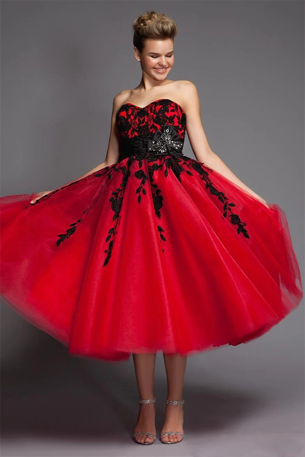 Cezom Black And Red Wedding Dresses Short Tulle Lace Mid Calf Short Red Wedding Dresses Sale