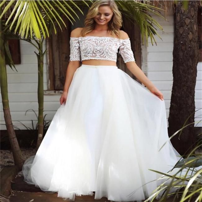 Discount China A Line White Boat Neck Short Sleeves Off Shoulder Short Summer Wedding Guest Dresses