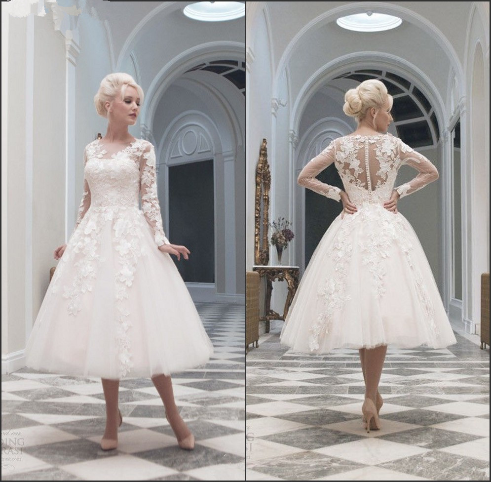Vintage Short Wedding Dresses Long Sleeve Knee Length Tiered Short Wedding Dresses With Long Sleeves