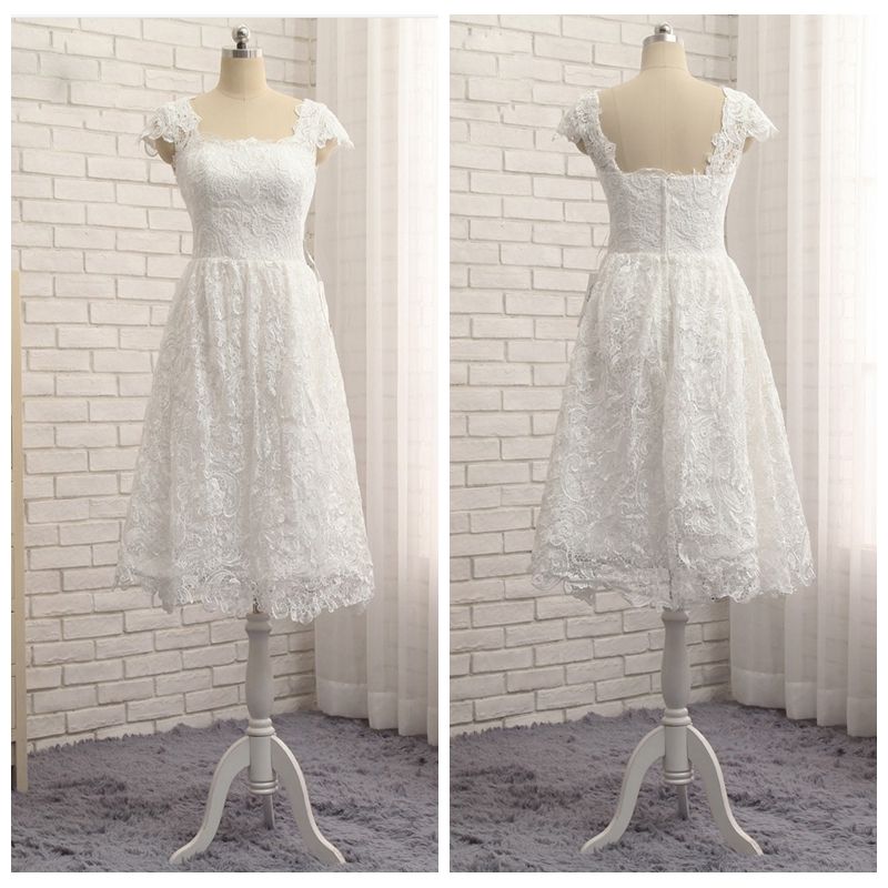Discount Square Neckline White Short Wedding Dress Elegant Lace Short White Simple Wedding Dress