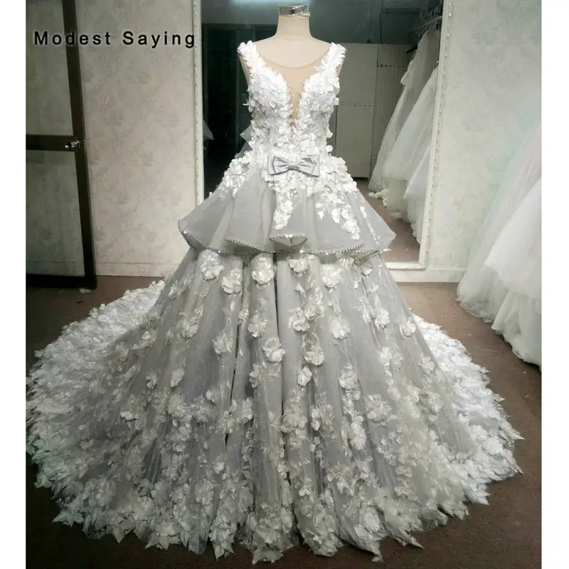 Modest Silver Lace Evening Dresses 2018 With Detachable Train Silver Wedding Dresses 2018