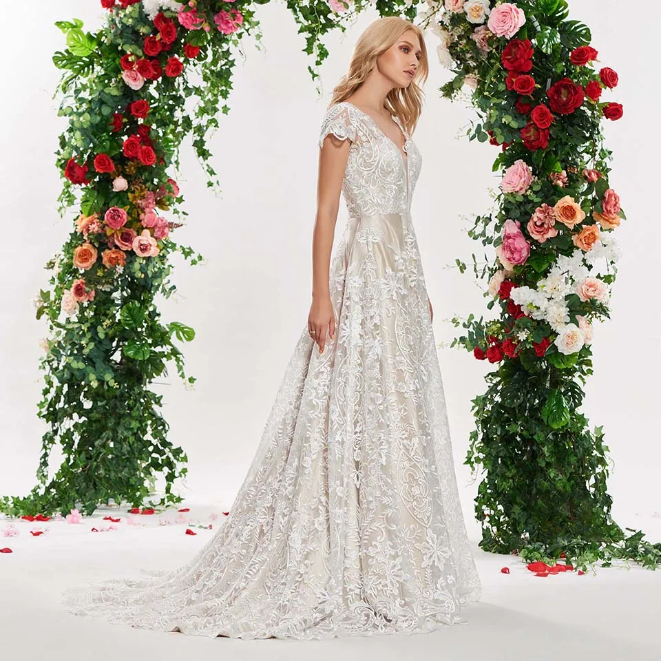 Dressv Elegant A Line V Neck Appliques Short Sleeves Wedding Dress Simple Wedding Dress With Short Sleeves