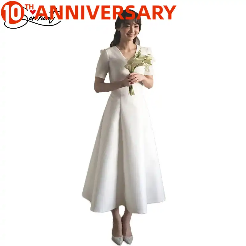 Latest Simple V Neck White Lace Wedding Gowns Chiffon Short Sleeve Simple Wedding Dresses With Short Sleeves