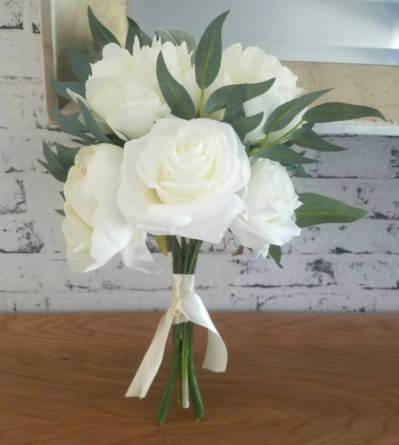 Peony Rose Green And White Rustic Wedding Bouquet Peonies Etsy Simple White Wedding Bouquets