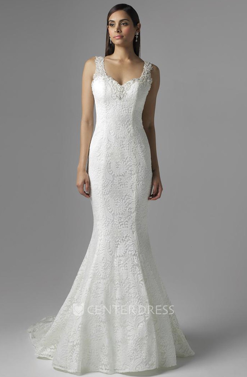 White Lace Sleeveless V Neck Floor Length Mermaid Style Wedding Sleeveless V Neck Lace Wedding Dress