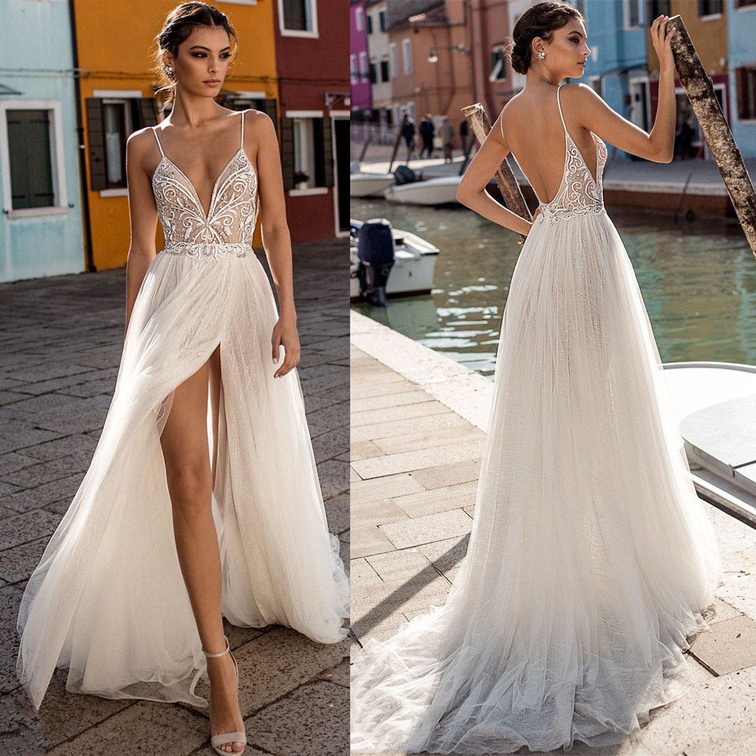 A Line Tulle Spaghetti Straps Long Wedding Dresses Backless Spaghetti Strap A Line Tulle Wedding Dress