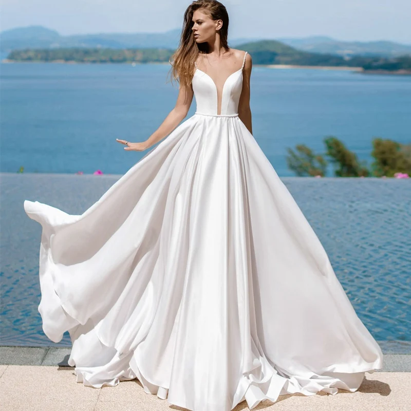 2018 Simple Wedding Dresses Spaghetti Strap Double V Neck Robe De Mariage Sleeveless Hard Satin A Line Bridal Gown Wedding Dress Aliexpress Spaghetti Strap Satin Wedding Dresses