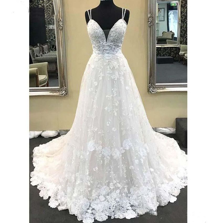 Discount 2020 New Charming Spaghetti Straps Lace Appliques A Line Spaghetti Strap V Neck A Line Wedding Dress