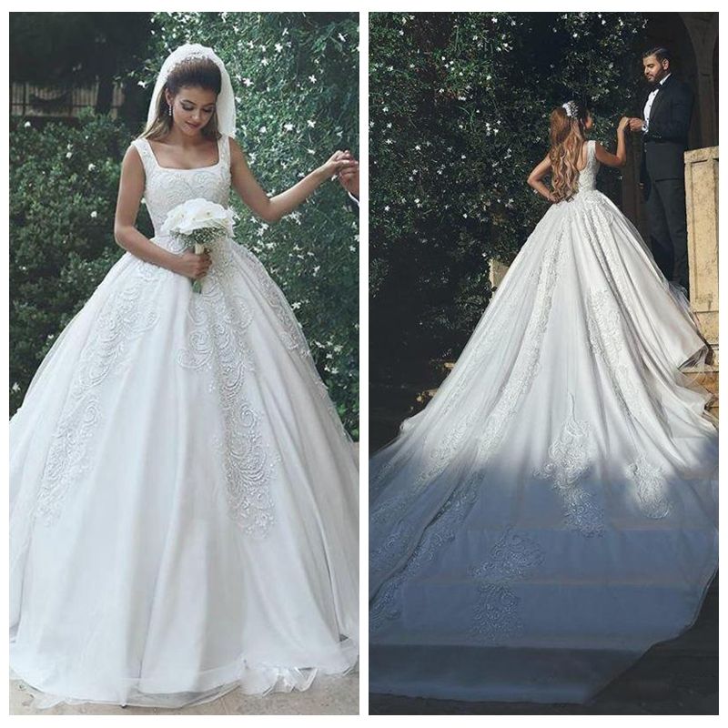 2019 Square Neck Ball Gown Wedding Dresses Lace Appliques Beaded Square Neck Wedding Dress Lace