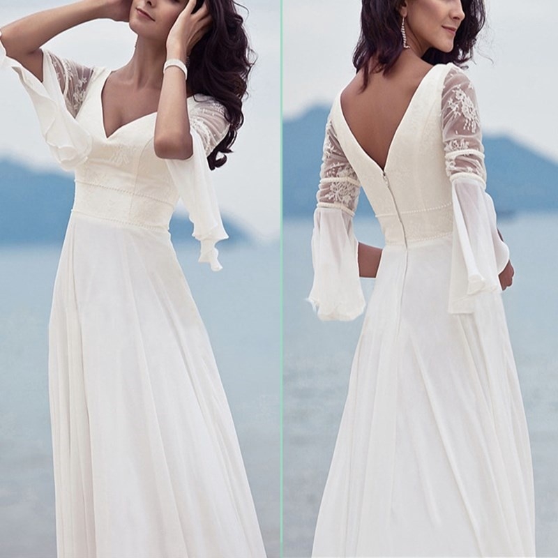 Women Summer Mesh Sleeve Dress Lace V Neck Long White Elegant Summer Dresses To Wear To A Beach Wedding
