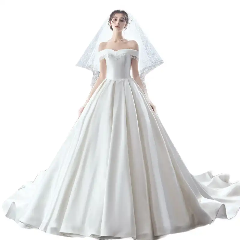 Satin Wedding Dress 2020 New Bride Word Shoulder Simple Hepburn Super Simple Wedding Dresses