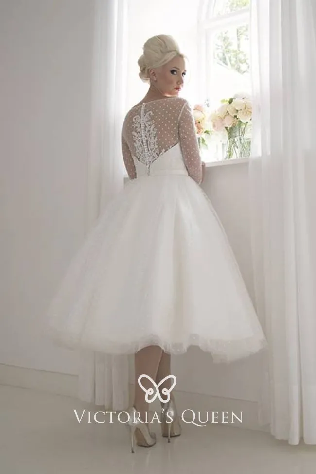 Fashion Vintage Ladies White Lace Bride Dresses Tea Length Wedding Tea Lenght Wedding Dresses