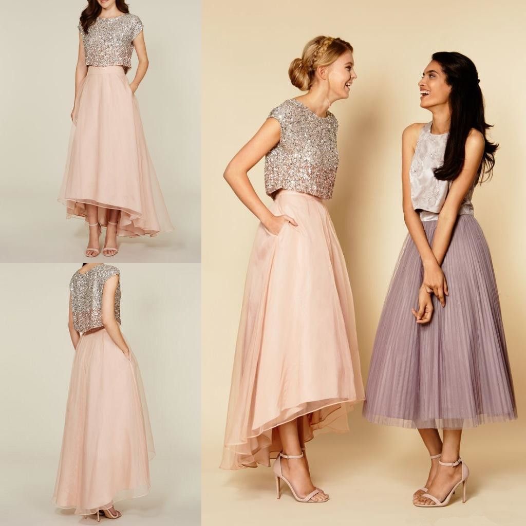 Sparkly Two Pieces Sequins Bridesmaid Dresses High Low Tea Length Tea Length Dresses Wedding Guest